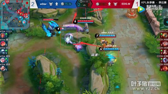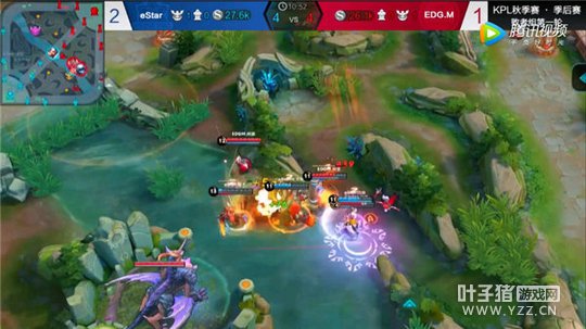 比赛进行到了十分多钟,双方在下路河道爆发了团战。因为蓝色方的张飞和花木兰有着较强的控制技能,并且百里守约的伤害非常高,于是露娜并没有选择马上参团,而是等张飞开打后再入团,这时候百里守约也已经阵亡。露娜打出的是一技能+大招+二技能+大招整套连招,在人群中打出了很好的消耗效果,并且在每次突进后露娜都有用普攻进行攻击,所以露娜快速的触发了被动技能的标记,从而也快速地进行刷大。在蓝色方想要逃跑的时候,露娜选择追击有位移技能的张飞,利用自己的高机动性成功将其击杀,而扁鹊也被队友击杀,因此红色方在此次团战中获得了较大的收益。