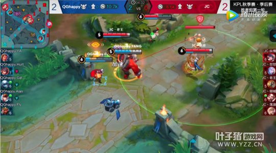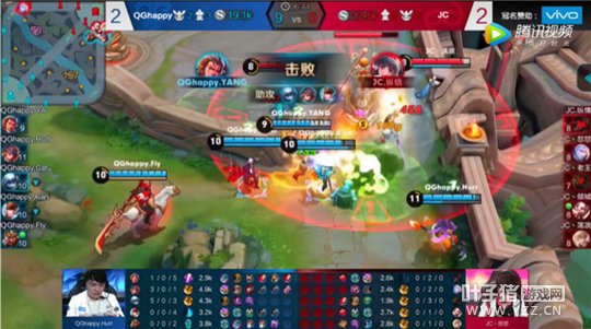 在该场比赛中,张飞频繁的游走于各路,利用二技能给队友套盾来减低敌人的消耗,这点很值得我们学习。