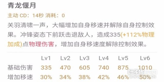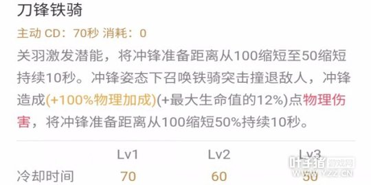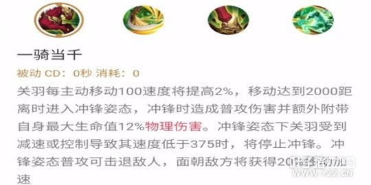 被动一骑当千;关羽的核心这个被动能转换关羽的三个技能和普通攻击。冲锋姿态给一技能三技能和撞击附带自身最大生命12%物理伤害,即使关羽出防御装备也有不俗的伤害。