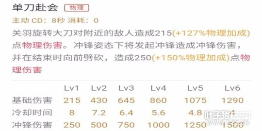 一技能单刀赴会:关羽站立时候一技能是旋转大刀,冲锋姿态时候是向敌人劈一刀。冲锋姿态劈一刀触发被动伤害比旋转大刀高。