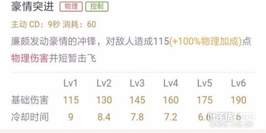 整体分析:一技能是一段突进,可以将命中的目标击飞,造成一定的伤害。这个技能给予廉颇很强的控制能力和一定的逃跑逃跑能力和追击能力,提高他的灵活性。