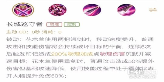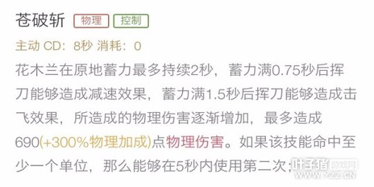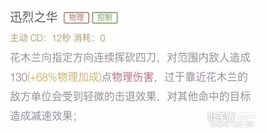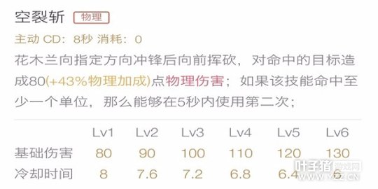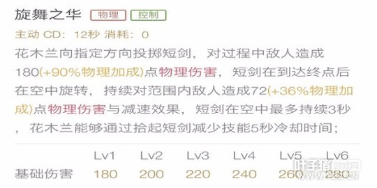 短剑形态数值分析:短剑形态下的1技能成长型并不是很高,但是在点满的情况下能让1技能只有6秒的冷却时间,短CD位移让花木兰更灵活。