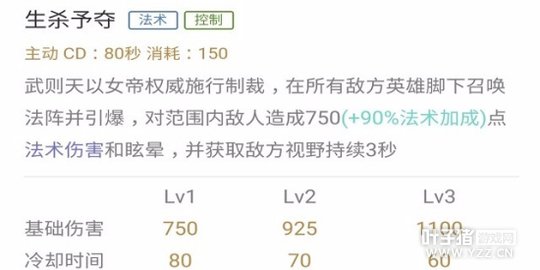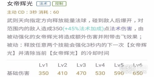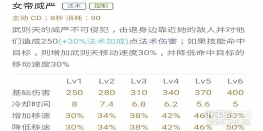 数值分析:这个技能初看只有45%的法术加成,但强化后伤害为双倍,因此加成会变为90%,所以武则天的法术强度依然能提高不少输出。另外控制时间现在为0.75秒,不能无缝接大。由于释放频率最高,建议主加提升输出。
