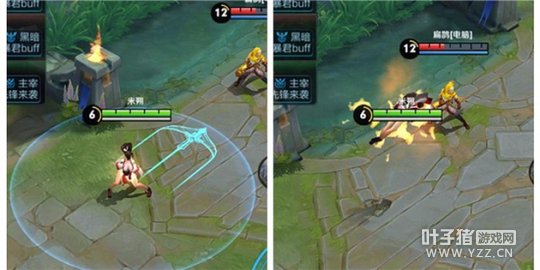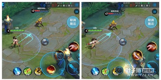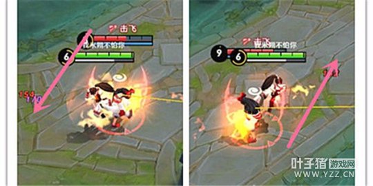 而火舞的施法指示器是一个圆弧范围,所以在和对面几乎重合的情况下使用一技能是必空的,这个时候只需要挪几步到图二的位置即可,这一点在使用2-3-1连招时极易出现,因为三技能把我们和敌方单位紧贴在一起,又为了连招手速基本上都是秒接,如果穿插一个被动翻滚那估计就直接脱离战场了,所以最好还是挪一下再用,也可以让控制时间更久: