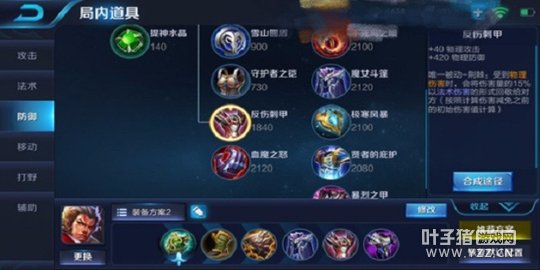 反伤刺甲提供了最高的物理防御,并且反伤刺甲被动荆棘可以将伤害量的15%以法术伤害的形式回敬对方,在中后期敌方射手的装备已经成型,输出非常高,这件装备在一定程度上克制了敌方射手输出。