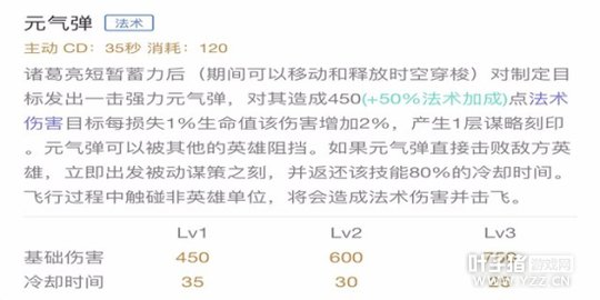 技能解析:诸葛亮短暂蓄力后(期间可以移动和释放时空穿梭)对制定目标发出一击强力元气弹,对其造成法术伤害目标每损失1%生命值该伤害增加2%,产生1层谋略刻印。元气弹可以被其他的英雄阻挡。如果元气弹直接击败敌方英雄,立即出发被动谋策之刻,并返还该技能80%的冷却时间。飞行过程中触碰非英雄单位,将会造成法术伤害并击飞。