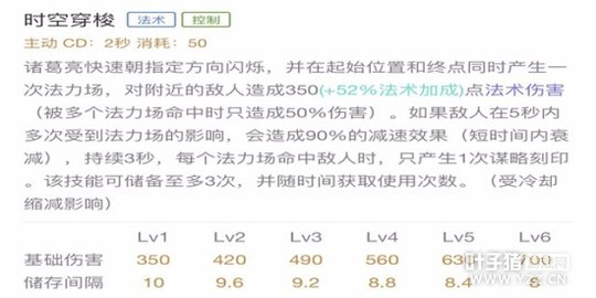 技能解析:诸葛亮快速朝指定方向闪烁,并在起始位置和终点同时产生一次法力场,对附近的敌人造成法术伤害(被多个法力场命中时只造成50%伤害)。如果敌人在5秒内多次受到法力场的影响,会造成90%的减速效果(短时间内衰减),持续3秒,每个法力场命中敌人时,只产生1次谋略刻印。该技能可储备至多3次,并随时间获取使用次数。(受冷却缩减影响)