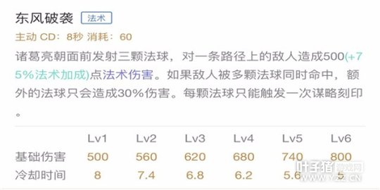 数值分析:基础伤害随着等级提升而增加,冷却时间后期达到了5秒,技能路径是以诸葛亮为中心的,越贴近目标伤害越高,可以用来消耗兵线,团战时如果自身带着被动,可以二技能贴近目标释放,打出高额伤害。
