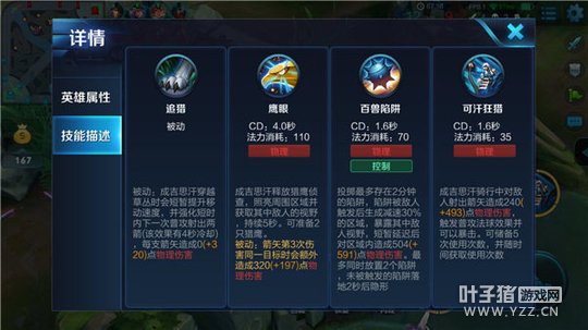 一技能——鹰眼:一技能是成吉思汗把控视野的重要基础,能保证成吉思汗前期发育的安全性,技能的被动效果,提高了成吉思汗的战场输出,不过要尽量的对同一目标进行攻击输出。