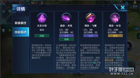 被动技能——大吉大利:被动技能是明世隐强力控制的重要保证,在任何时期都能通过近距离普攻控制住敌人,为队友或创造良好的输出环境。不过要注意,晕眩控制存在冷却时间。