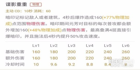 解析:李元芳对敌人或者建筑物进行标记,4秒后引爆造成一定的物理伤害。在目标被标记期间,李元芳的每次普攻都会为标记增强爆炸的伤害,最高叠满四层并直接引爆。并且施法后4秒内提高50%的攻击速度和75点攻击射程。这个技能是元芳的核心输出技能,无论是对敌人还是对建筑物都可以在短时间内造成高额的伤害,并且标记在爆炸的时候对周围的敌军也能造成一定的伤害。