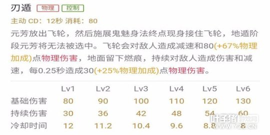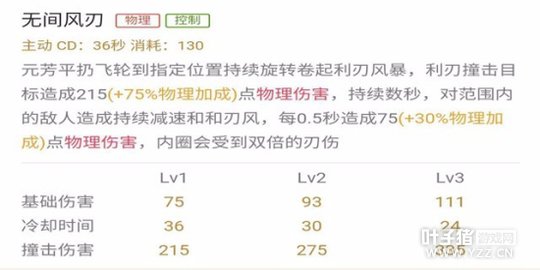 解析:李元芳将飞轮扔到指定地点,利刃撞击目标会造成一定的物理伤害,持续数秒,对范围内的敌军造成持续减速和伤害。位于飞轮内圈的敌军会受到双倍的刃伤。且该飞轮可以叠加标记的层数。李元芳在团战时将该技能仍及敌方阵营中,可以对敌方造成群体性伤害,并且该技能也可以让被标记的目标身上的印记快速的叠满并引爆,在短时间内对敌军造成高额的伤害。该技能在封路,逼迫走位或者抢大小龙等方面都有出色的作用。
