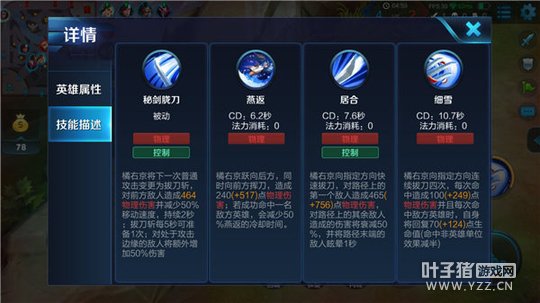 解析:橘右京快速向前出剑,对路径上的敌人造成伤害,第一个敌人受到的伤害最高,剑气末端的敌人会被短暂晕眩。二技能是橘右京主要的控制技能,有很高的伤害。使用时注意提高命中率。