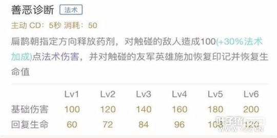 技能解析:AOE伤害技能,有不错的消耗能力,前期清兵发育的神技能。中后期打团时技能的减速效果可以更加轻松的黏住敌人,一技能在团战中可以朝敌方聚集的地方释放,即使没有命中也可以用来限制敌方走位。二技能:善恶诊断