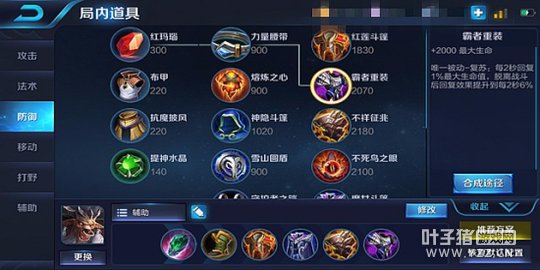 最后一件选择霸者重装。所有装备中增加血量最多的装备,直接大幅度提升牛魔的坦度。同时高额的血量配合红莲斗篷在后期能够对敌方造成客观的伤害。同时,被动的存在能够让牛魔在后期边游走边回血减少回家补给次数。
