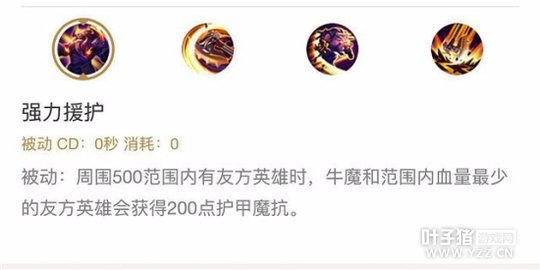 解析:500范围内增加自己和范围内血量最少的友方英雄,这使得牛魔在战斗时需要一直保持在队友身边,才能保持最大收益。200的护甲和法术防御相当于为后排补充了两件抗性装备。