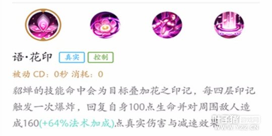 貂蝉的真实伤害来源,4个印记触发范围真实伤害及减速同时给自己回血,触发来源一技能来回两次印记,二技能三次印记,三技能施法结束一次印记,被动范围爆炸一次印记(触发爆炸单位不产生),被动让貂蝉纵使出半肉也能打出不错的输出伤害,前戏线上依靠触发被动回血也很提供续航,基础真实伤害及加成不低,两到三件的法术装备足以撑起貂蝉的输出。