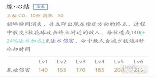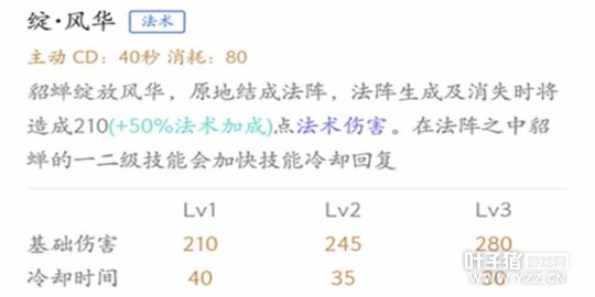 貂蝉在结成的法阵中一二技能冷却会加快回复,让貂蝉能更频繁的粘人触发被动真实伤害,在团战中貂蝉若能一直站在法阵中输出能让其收益最大化,技能的本身伤害及法术加成基本可以忽略,注意的是结成法阵瞬间范围内敌人都会产生一层印记,常规连招二技能贴近单个敌人(三枚花球)+三技能开启打出被动之后施放后续爆发(法阵消失时的印记与伤害基本不会中),前期冷却时间较长尽量找准施放时机,后期满等级三技能配合满cd(这是貂蝉必需的)冷却时间会少很多。