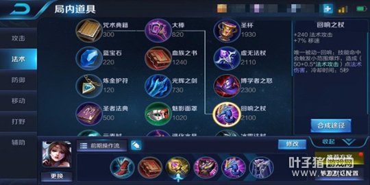 第五件应该选择出法术攻击装备,毕竟前面所提供的法术攻击有限,可选择回响之杖提升消耗能力及总体移速。选择炽热支配者提升蓝量及残血对拼能力(敌方有真实伤害不考虑),提升打坦穿透能力选择虚无法杖(痛苦面具提升的冷却会有所溢出,且75点法穿后期效果一般,不推荐做)