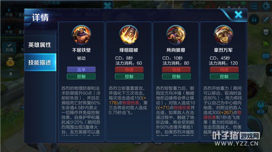 大招-豪烈万军:苏烈开始蓄力,期间内可进行移动,取消施法时会有一定的冷却时间,苏烈用柱子以自己为中心砸向地面,对附近的敌人造成物理伤害和击飞效果,蓄力的时间越长,攻击范围越大,造成的伤害也就越高。每个击飞的敌人在落地后,会再一次受到额外的物理伤害。被动:苏烈释放技能攻击或释放强化普攻时将引发地震,短时间持续对附近的敌人和建筑造成法术伤害。