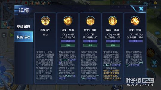 被动技能——辉煌指引:被动技能提高了女娲对周围战场视野的把控能力,并且等级越高女娲的攻击范围也会变大。而被动的标记效果,能提高队友的机动性和战场存活。
