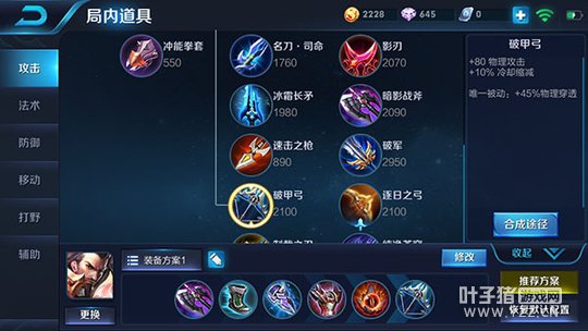 破甲弓:专门针对敌方的战士和坦克英雄,防止出现后期由于敌人出了过多的防御装,从而导致曹操打不出高额伤害的情况。
