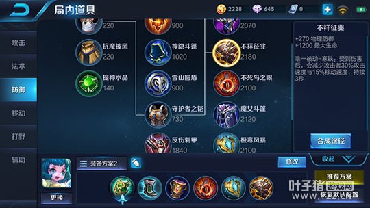 分析:对于其他英雄来说,法术防御装备选择魔女斗篷更好一些,但是对于蔡文姬来说,不死鸟之眼才是最好的选择,因为不死鸟之眼的被动效果配合蔡文姬的回复能力,让蔡文姬的续航能力更强,敌人更难将蔡文姬击杀;不祥征兆则是为蔡文姬提供了物理防御和生命值,最重要的还是它的被动效果,能够减少攻击蔡文姬的敌人的攻速和移速,配合极寒风暴,在团战中会让敌人非常难受。