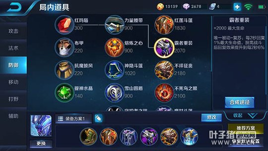 分析:在前两件装备都是物抗装的前提下,第三件装备我们推荐做出魔女斗篷。此装备是对抗消耗型法师最有效的选择,它能为脱战后的白起提供一个能吸收法术伤害的护盾。而第四件装备我们希望能提高白起大招的嘲讽时间,确保他在中期团战中能更好的限制敌方后排的走位。所以装备的选择,我们推荐玩家做出霸者重装。此装备能为白起带来大量的最大生命属性,并且还能提高他的生命回复效果,减少中期他因为血量过低而回城的几率。