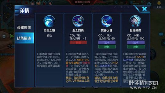 一技能是白起最主要的输出手段,技能特点可以总结为以下三点:1、此技能是范围伤害,技能伤害除了受等级的影响外,玩家还可以通过增加白起的物理攻击属性和最大生命属性来增加技能伤害;2、此技能还可以回复白起已损失的生命值,如果命中敌方英雄将获得额外生命回复收益。结合自身被动的减伤效果,白起能够在残血状态下奋勇杀敌,有很大机会将敌人反杀;3、白起受伤时将有几率自动释放血之回响,这使得白起在实战中能够频繁释放一技能输出敌人。