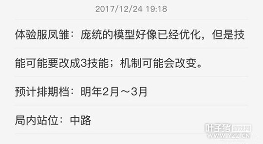 庞统的模型最近正在优化,技能和机制也会修改;庞统的英雄职业仍然为刺客,推荐分路中路,团战位置仍然是后排位置;庞统的大致档期安排将在新年版本发布后的2~3月正式上线。