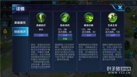 被动-恶德医疗:扁鹊在释放普攻和技能后,会附带持续法术伤害的中毒效果,并叠加毒药印记,若是印记叠加在友军身上,会提供治疗效果加成(印记可叠加,但有上限)。