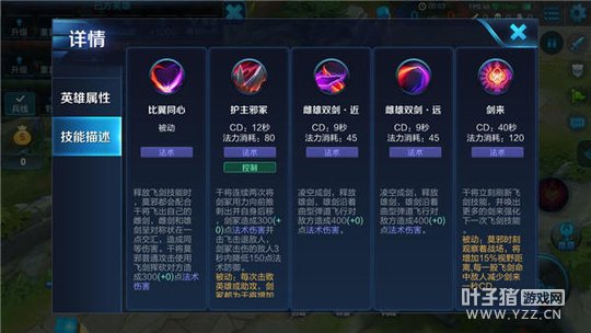 干将莫邪释放飞剑技能时,干将与莫邪会彼此配合抛出飞剑,呈对称状态飞行到交汇点,造成高额的伤害,同时普攻时,将附带高额的法术伤害。