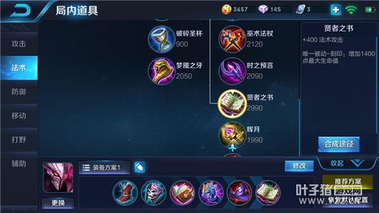 后期核心装备:博学者之怒+贤者之书,博学者之怒提供高额的法术攻击加成,提升输出能力;贤者之书提供高额法强以及生命值,即提升伤害又增强生存能力。