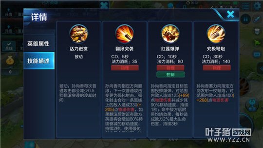 一技能-翻滚突袭:孙尚香向指定方向翻滚,并强化下一次普攻,对一条直线上的敌人造成物理伤害,拖翻滚后附近有敌方英雄存在,会增加移速(持续衰减),孙尚香在使用强化射击后,会增加下一次普攻的攻击距离。