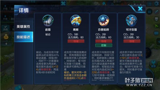 一技能-鹰眼:成吉思汗释放猎鹰侦查,照亮周围区域,并在短时间内获取区域内敌人的视野,猎鹰的准备需要一定的时间,且同时最多可拥有两只猎鹰。被动:成吉思汗的箭矢对同一个目标的第三次攻击,会额外造成物理伤害。