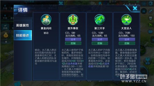 被动-黄金闪闪:太乙真人周围若有敌方非英雄单位死亡时,太乙真人和附近的队友会获得额外的金币加成。