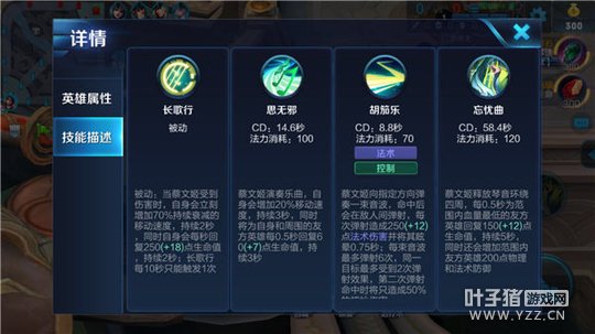 被动技能——长歌行:被动技能增强了蔡文姬的战场存活,蔡文姬被抓时,可利用加速效果,迅速逃出敌方的攻击范围;蔡文姬也可利用小兵或野怪,回复自身已损生命值。