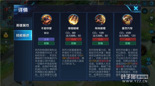 苏烈有着高于他人的防御能力,能在战场中为队友抗下跟多的伤害,并且苏烈的控制能力和输出能力都不俗,是个十分优秀的英雄。