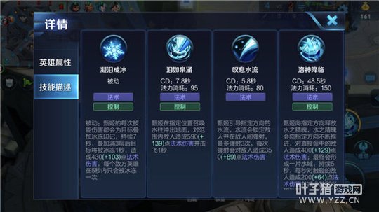一技能——泪如泉涌:一技能是甄姬的范围控制技能,不过技能施放时有一定的延迟,需要预判敌人的走位,因此后手配合队友使用,可以增加技能的命中率。