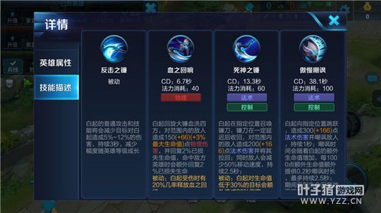 解析:主要输出技能,可以对小范围内的敌人造成伤害,并为自己回复一定的血量,如果此时同时命中敌人,还能为白起回复额外的血量,增强了他的续航能力;另外白起在遭到攻击时有一定的几率自动释放该技能,这让白起的持续输出能力更强。