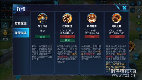 被动-石之炼金:钟无艳的普通攻击和技能有50%几率使敌方石化1秒,石化1秒后的英雄8秒内不会再被石化。