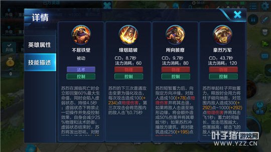 苏烈集控制、输出、抗压于一体,不仅能很好地保护队友不受敌人侵犯,同时在战场上,能利用技能优势在前排消耗敌方技能,为队友提供更多的输出空间,苏烈的被动提供“复活”效果使其拥有更充足的战斗力,也因此成为大多数玩家喜爱的战士之一。