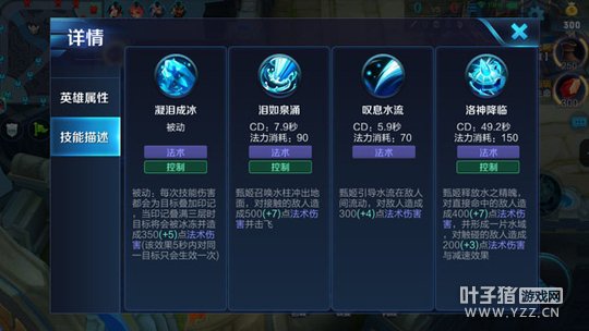 一技能-泪如泉涌:甄姬在指定位置召唤水柱,短暂延迟后冲出地面,对触碰到的敌人造成法术伤害与击飞效果。
