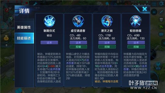 二技能-湮灭之锁:钟馗朝指定方向投出钩锁,并将命中的第一个目标拉至面前,造成法术伤害的同时,还将对目标添加一个标记,标记存在期间,钟馗大招的每段伤害都将对其造成额外的晕眩效果。被动:钟馗每次获得助攻或击杀对手时,都将提高部分最大生命值,该效果可多次叠加,但有上限。