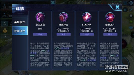 被动-永生之血:芈月释放技能时会召获得能量值,并召唤暗影仆从(有上限)自动搜寻身边敌人进行攻击,造成法术伤害并回复芈月的生命值。能量值消失后暗影仆从也会随之消失。