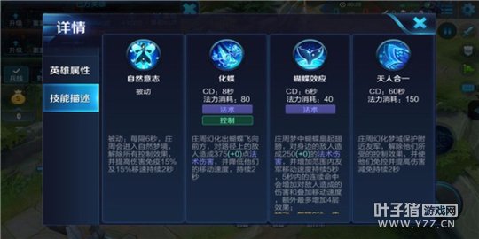 庄周的一技能是庄周幻化出蝴蝶对前方敌人造成伤害和减速,庄周的一技能命中目标后还会继续向前飞行,这个技能是庄周的唯一控制性技能,而且还可以用来探草丛。