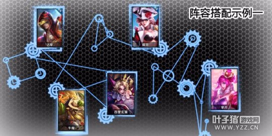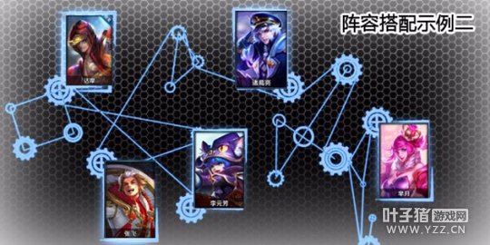 套路讲解:这种阵容搭配的核心点通常以双核为主,讲的是羋月走下、另一个战士边路上单、射手走中、辅助游走,时常四人抱团,边路分推。首先羋月作为边线的强者自顾一路是没有问题的,而射手走中辅助配合打野游走的话整个的战场联动效果会非常好,而且在成功配合GANK掉敌方英雄后或者强势压制时还能第一时间进行拆塔压制。在该套阵容里中单射手最常见的便是虞姬与百里守约,因为这两名英雄的前期配合能力强,不像孙尚香、马可波罗这类吃经济发育的中后期射手那么无力,其次打野英雄的话则以刺客或是战士为主,比如玄策、达摩。这两名打野兼备了控制、联动与强势GANK的能力。而在辅助方面除了适量的入侵能力之外还需要考虑到团战承伤能力,这是双边的基本条件,假如打野是玄策,那么辅助可以考虑张飞、牛魔,而如果是达摩,那么配一个孙膑辅助,同样能达到该效果。至于上单边路,通常需要比较抗压的英雄,且最好带有团战切后排能力,比如花木兰、铠、老夫子。