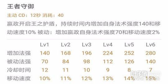技能解析:该技能可以为嬴政提供大量的法术攻击与移速加成,且只要护盾不被击破便会一直存在。该技能的特性注定了嬴政先天拥有比其他法师更高的法术攻击加成,让使用嬴政的玩家能第一时间赢在起跑线上。
