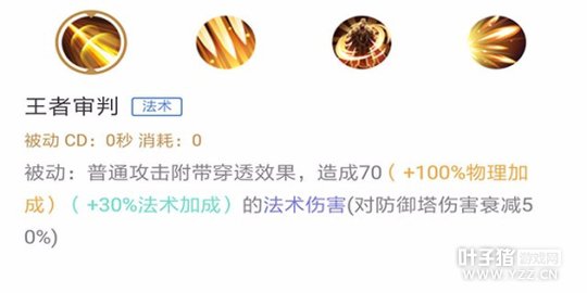 技能解析:嬴政的普攻拥有直线穿透效果,这也是其作为点券英雄的独特点。该被动直接将嬴政的普攻转化为双属性加成的法术伤害输出,奠定了嬴政前期高伤害、收线快的基础,有效的加快他的发育成型。