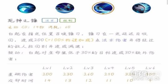 整体分析:白起使用镰刀将范围内敌人拉至身前,减速并造成物理伤害。该技能配合大招往往能发挥出白起在团战中的最大效益。